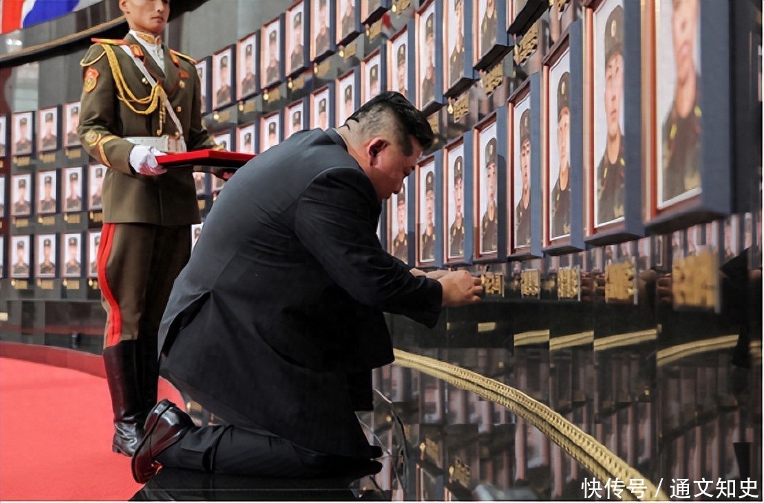 仪式现场气氛悲壮,照片排满整面墙壁,每张照片下方都用金色刻上士兵名字。金正恩不仅亲自向幸存士兵颁发共和国英雄称号、勋章和奖章,还为101名阵亡军人追授奖章。